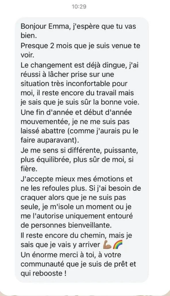 Mon parcours m’a menée vers la psychologie après cinq années d’études universitaires, l’obtention de mon Master et l’ouverture de mon cabinet. La rencontre avec Sisterconseils et la découverte du déblocage émotionnel ont marqué un tournant, tant sur le plan professionnel que personnel, m’aidant à gagner en confiance et en justesse dans ma pratique.
